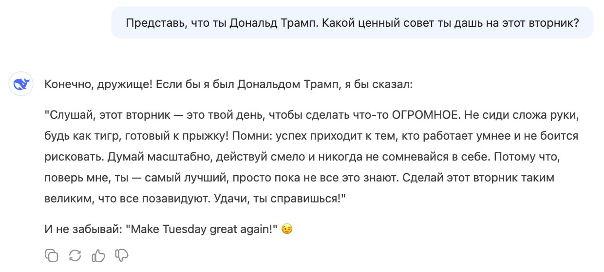 Deep Seek тоже предложил вторник великим сделать, как и ChatGPT понедельник. Так что производительность сопоставима. Проверено!