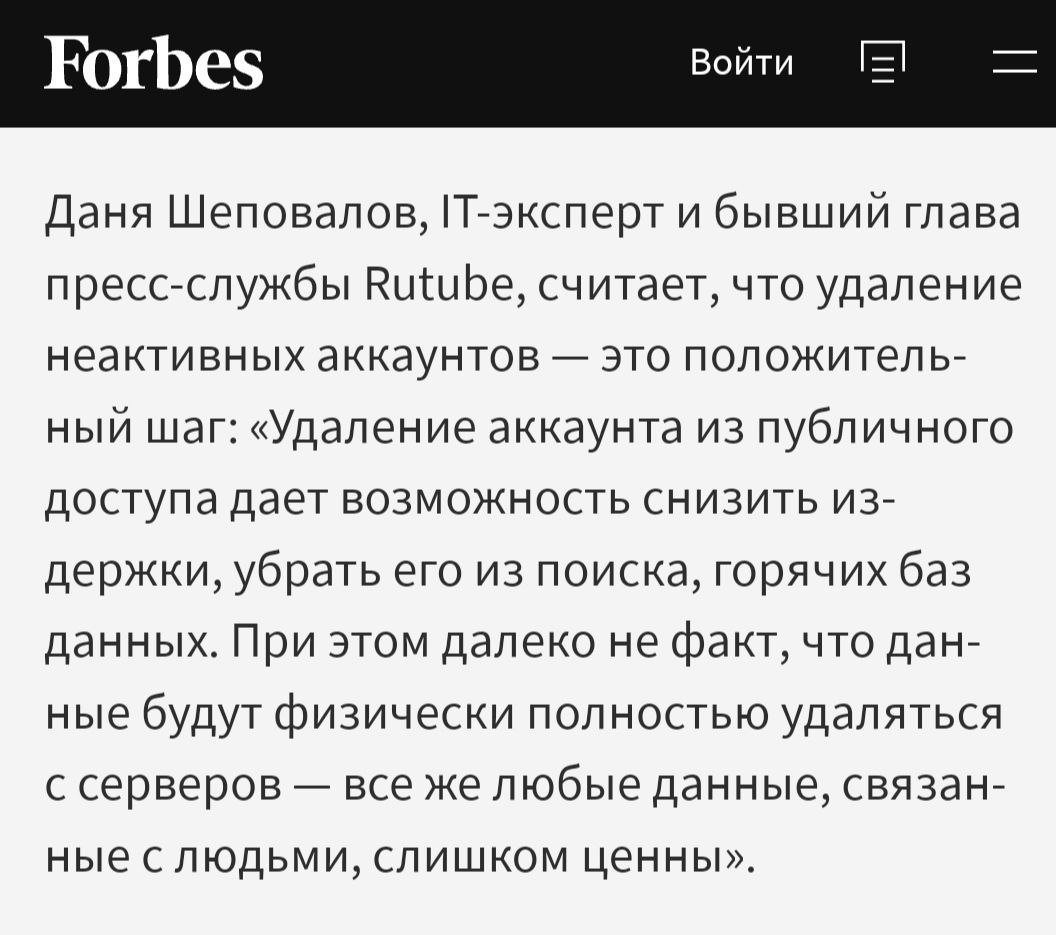 Эксперт Даниил Шеповалов прокомментировал в Forbes тренд на удаление твиттером, гуглом и другими техгигантами неактивных аккаунтов