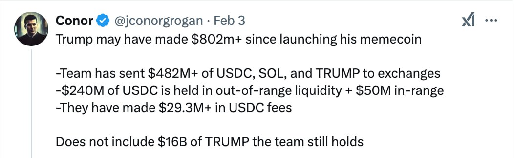 Глава продуктового отдела Coinbase посчитал, что на мемкоине TRUMP Дональд Трамп заработал больше $800 миллионов. Все же помогли Трампу заработать? Пишите в комментах на сколько помогли. Один мой друг на $8. На 0.000001% получается! Нормально 🧐