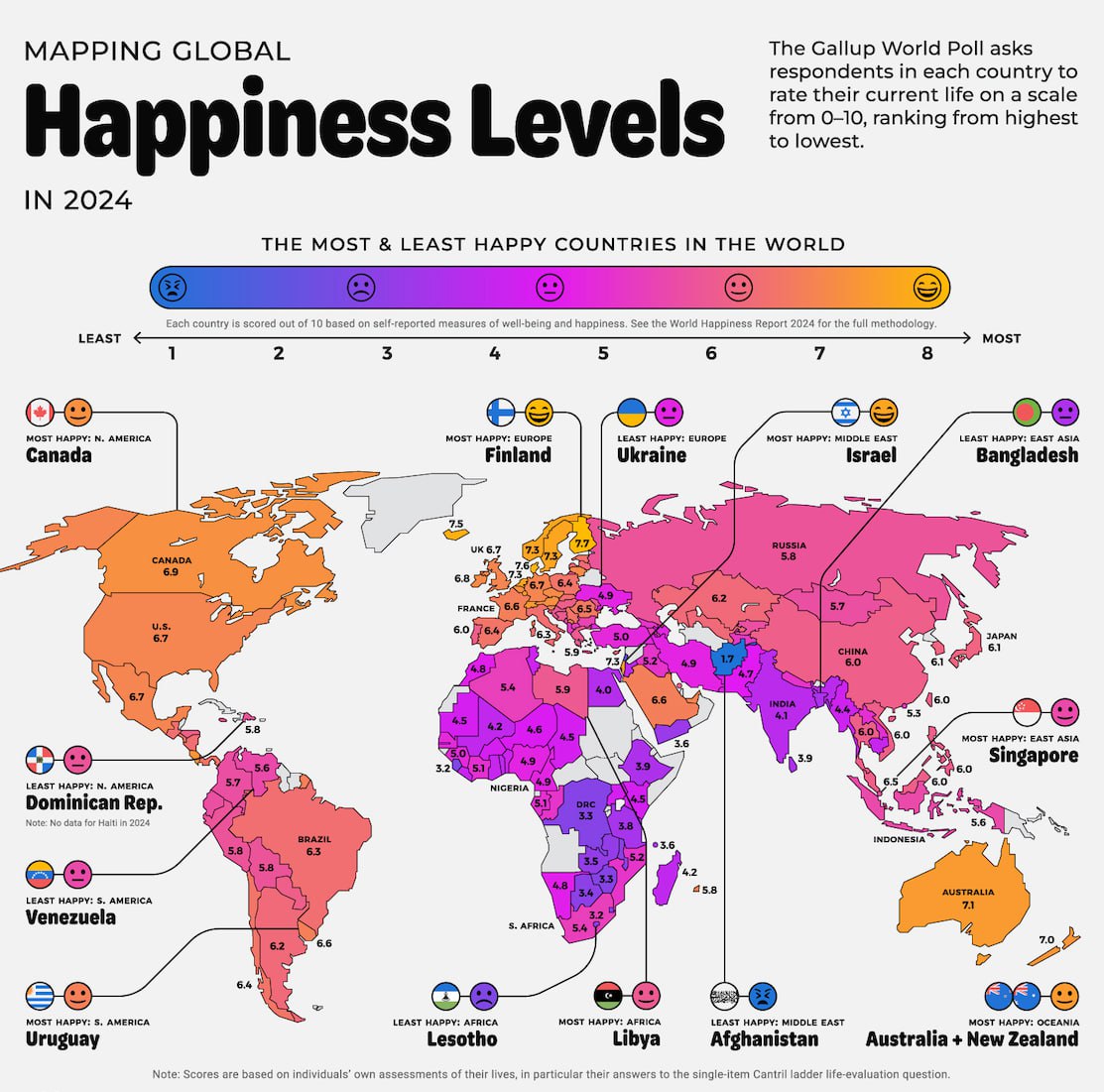 Инфографика по счастью. Чем оранжевее - тем счастливее люди в стране. Про Австралию в принципе я могу понять: свинтили подальше ото всех и рады, ебитесь там во всем остальном мире как хотите. Но в Исландии-то чего все такие чересчур довольные?