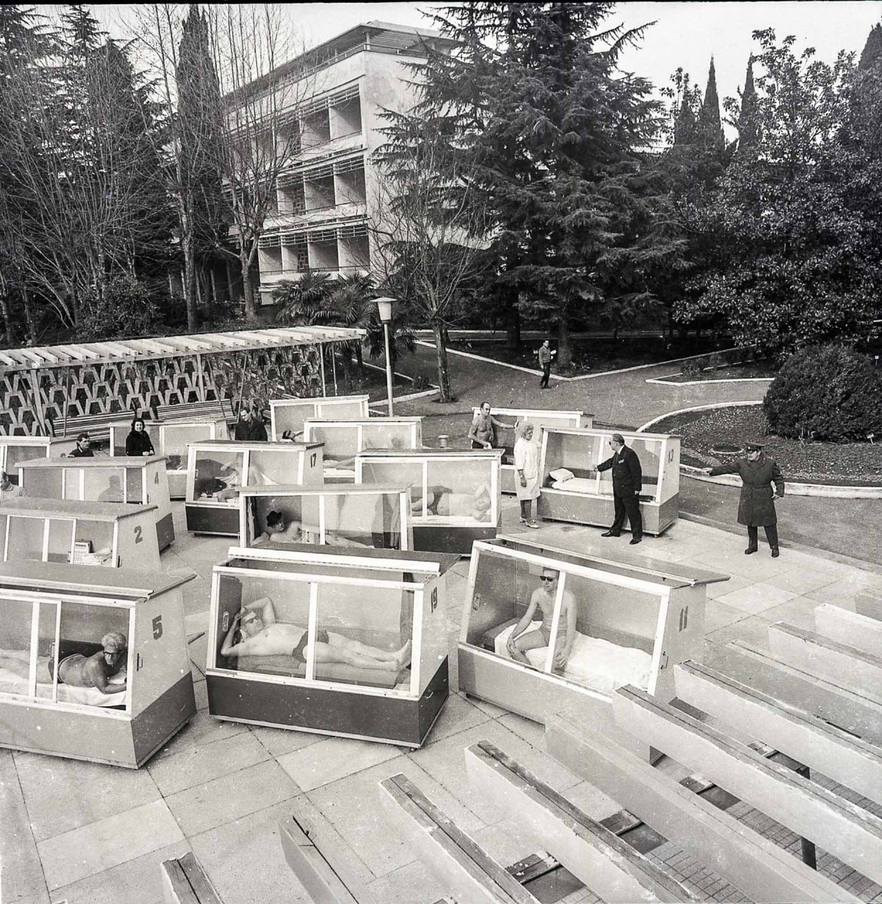 Кабинки для зимнего загара в Сочи. Но нужна другая подпись конечно. Есть варианты? Мой - "Майор КГБ нахваливает выставленных на продажу советских диссидентов"
