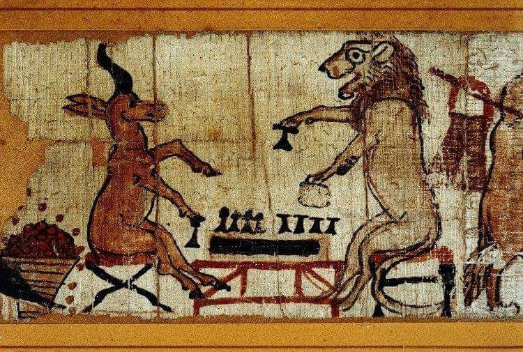 Коллеги, собираем симпозиум. Говорят, папирус, 1200 год до нашей эры. Что тут изображено? Газель поставила в шахматы корзину навоза, лев - кошелек, а кто-то там справа, кто уходит, выиграл штаны?