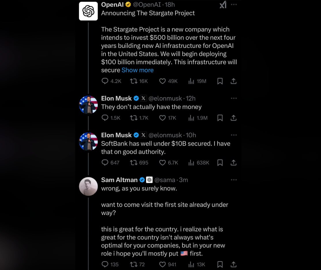 OpenAI: Старгейт проджект! $500 миллиардов! Илон Маск: Да нету у них по факту $500 миллиардов. Ну может $10 миллиардов есть. Да и то вряд ли. Сам Альтман: А ты не завидуй! Господин назначил нас любимой компанией!