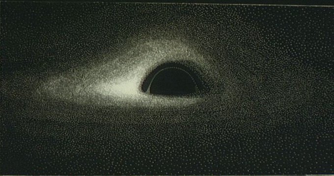 Первое изображение черной дыры, которое Jean-Pierre Luminet просчитал в 1978 году на IBM 7040 с помощью перфокарт. На глаз доброго крокодила-улыбаки похоже же?