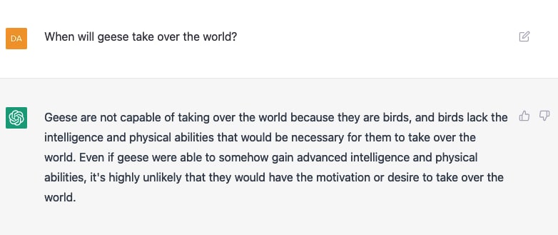 Спросил новый нейрочат, когда гуси захватят мир. Говорит: никогда не смогут, потому что у гусей не хватит интеллекта и физической силы для этого… Чувствует, видимо, опасность в гусях, заранее пытается дискредитировать.