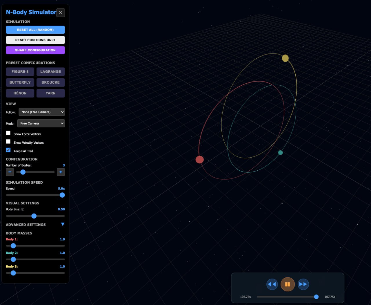 “Задача трех тел” - это не только книга китайского фантаста Лю Цысиня, но и реальная задача про сложное поведение трех небесных тел. Вот тут запилили браузерный симулятор задачи N тел. Можно выставлять 3 или больше шариков и любоваться безудержным хаосом. Как говорил товарищ Си, два небесных тела - это компания, а три - несанкцинированный митинг.
