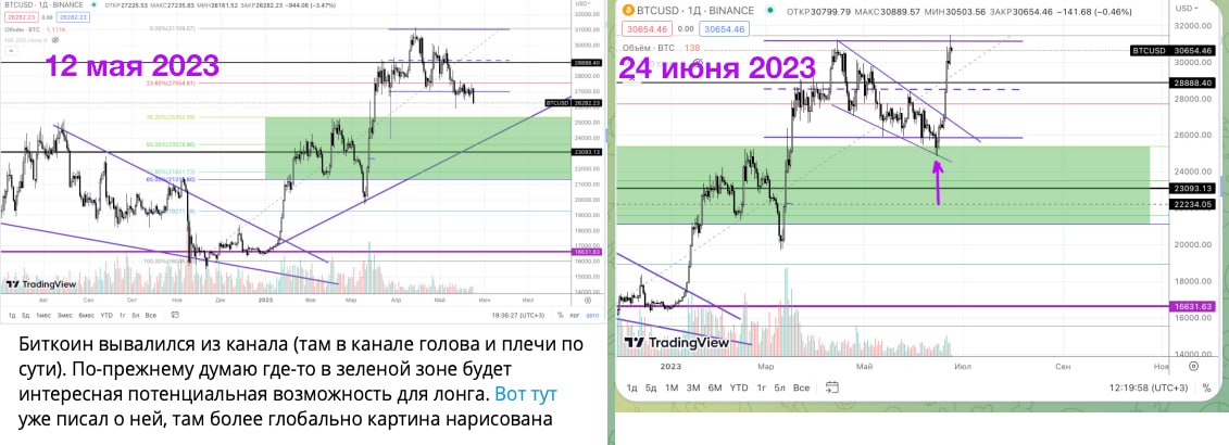 Наверное, не самое лучшее время хвастаться. Но эксперт Даниил Шеповалов там снова за полтора месяца предсказал, где можно дешево покупать биткоин (отмечено зеленым в мае). Можно было 14 июня купить биткоин по $25к, а продать за $30к сегодня. О таких штуках пишу в канале