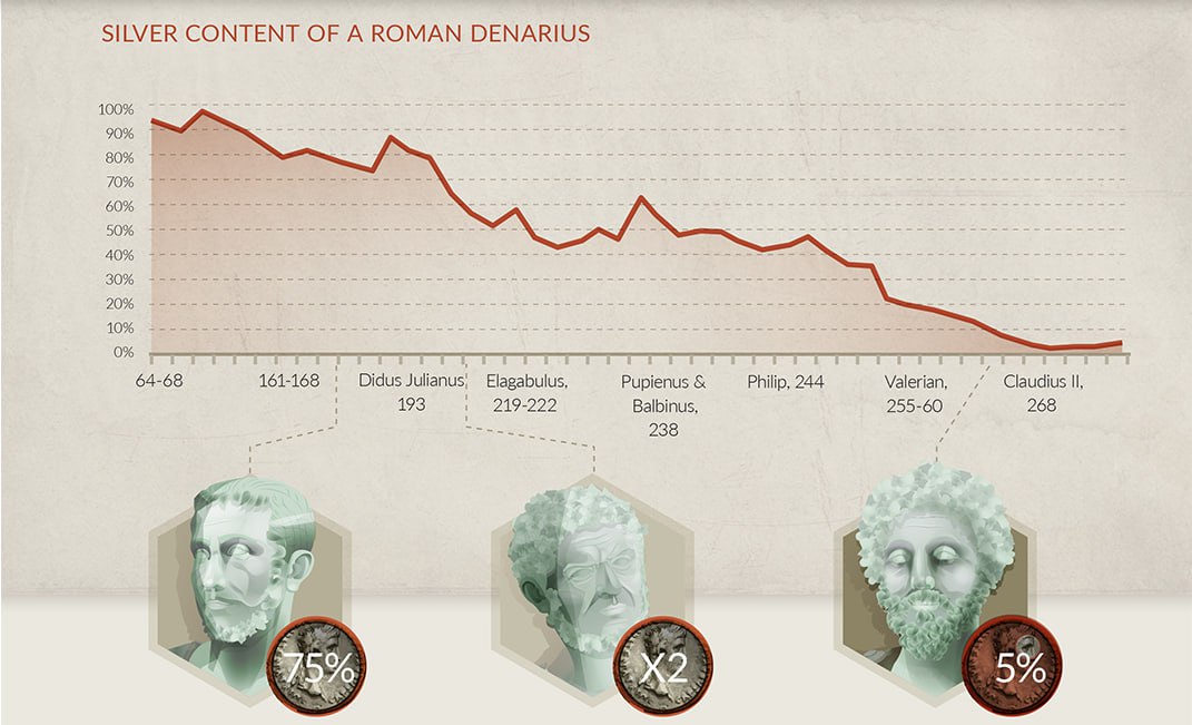 Кстати вот про биткоин. Наткнулся на интересную инфографику на Visual Capitalist, типа почему рухнула Римская империя. Оказалось, не из-за варваров и прочего. А суть в том, что всю дорогу бодяжили свою валюту: серебряный римский динарий. Сначала он был полностью серебряный, а по мере роста империи начали разбавлять, уменьшать количество серебра в каждой монете, чтобы финансировать пьянки с гетерами и военные походы. В итоге там 5% серебра вообще осталось в каждой монете. Началась гиперинфляция, и все пропало.