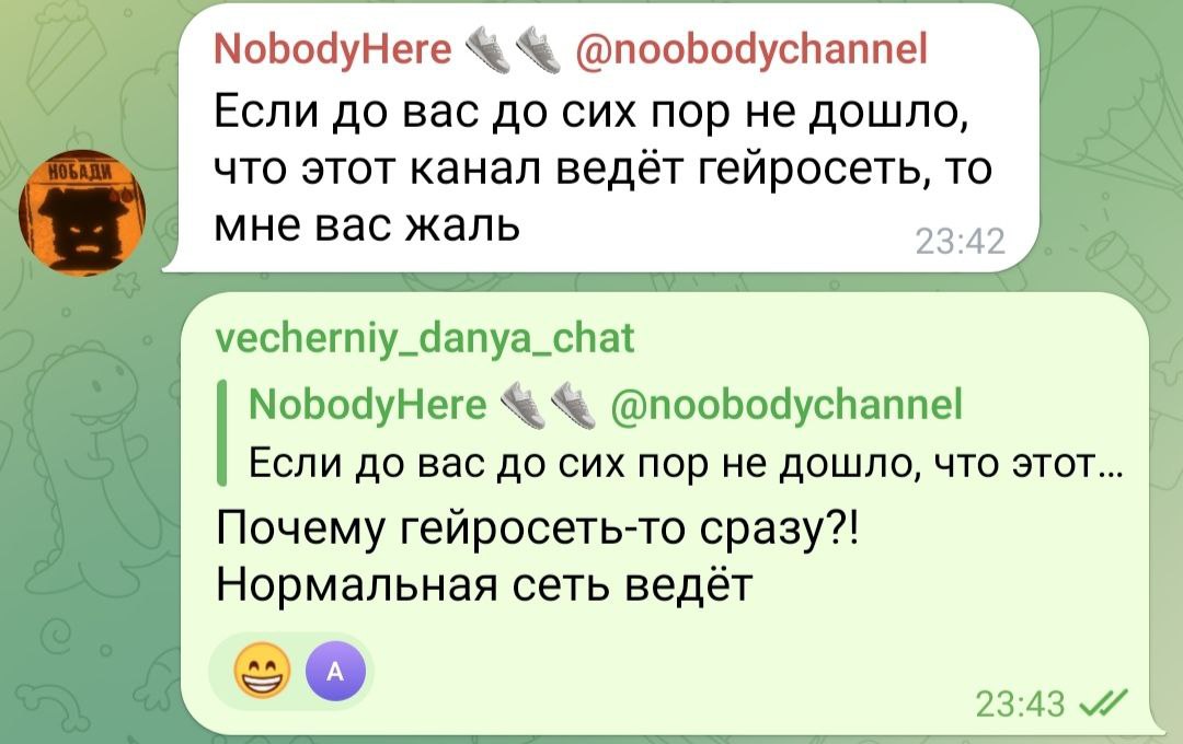 Создал отдельный тг-канал "Нейролаб", где будут выкладываться все новые нейроэксперименты. Кто любит роботов и ненавидит писанину человеков - добавляйтесь туда, а отсюда выписывайтесь
