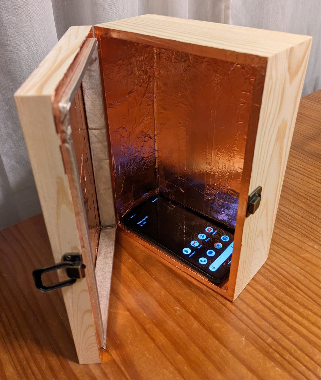 Элегантная клетка Фарадея из меди и сосны для смартфона. Не пропускает wifi, bluetooth, сотовую связь. Из нее даже экстренный sos-звонок не получится сделать. Вы же делаете иногда для себя информационную депривацию, вот смартфонам тоже можно такую устраивать. Как минимум, в такой коробке они временно не докладывают товарищу Си, что вы покушали и покакали.