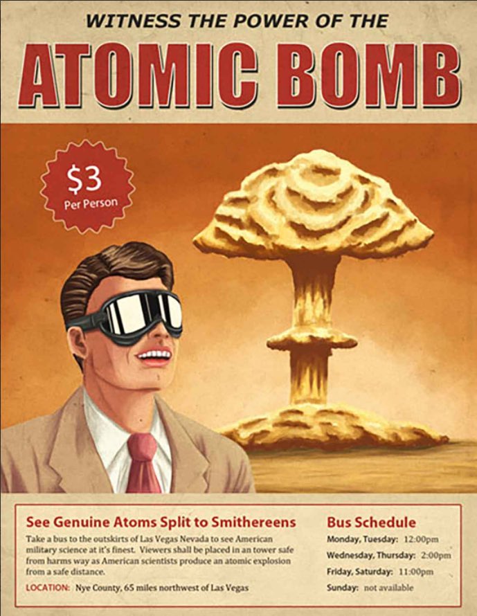 В 50-х годах недалеко от Лас-Вегаса можно было посмотреть ядерный взрыв всего за $3. Вот что я называю шоу-бизнесом! Но у наших времен тоже плюсы есть, мы все скоро может бесплатно посмотрим. Даже на автобусе не надо будет никуда ехать.