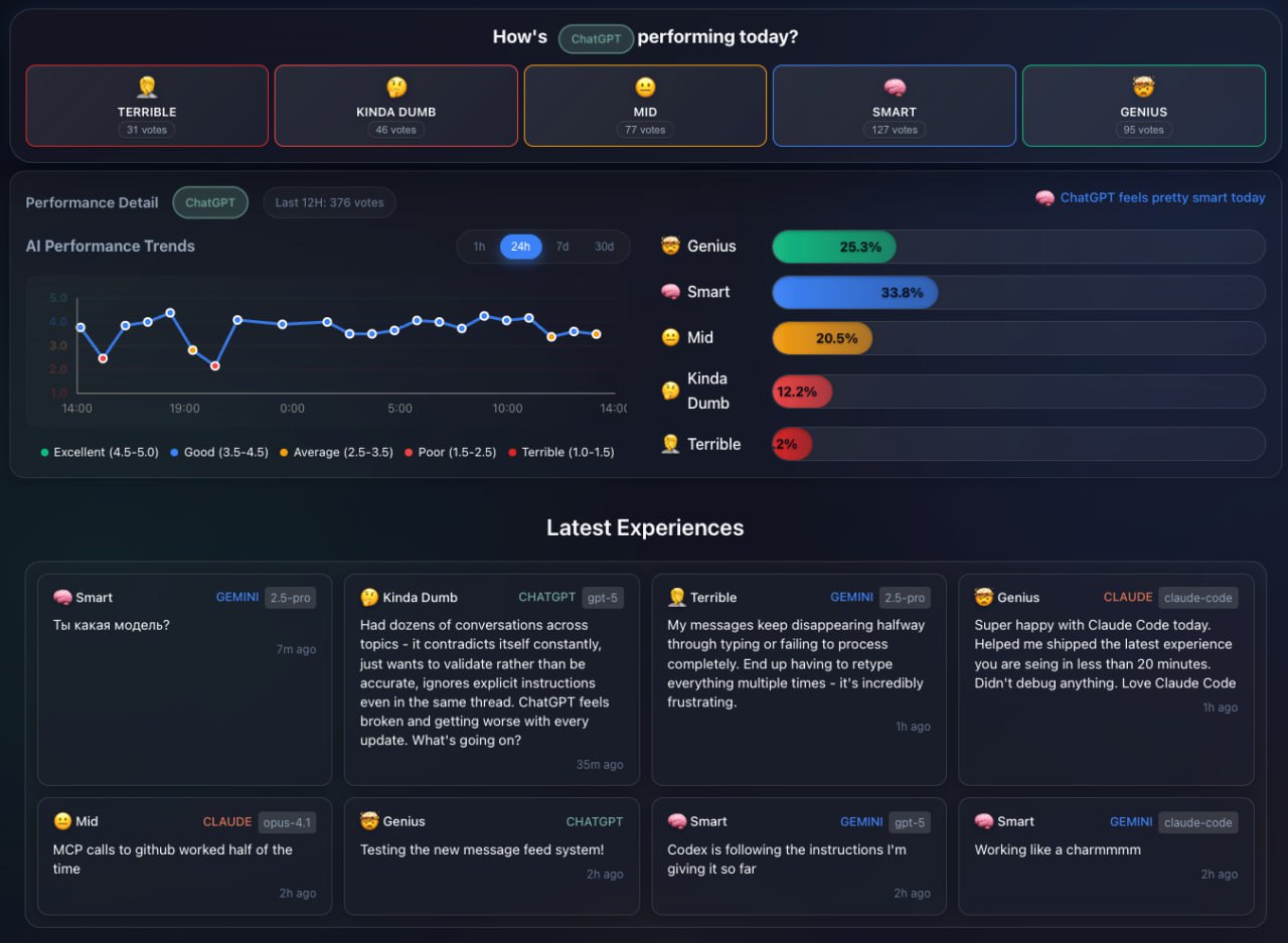 У нейронок иногда бывает плохое настроение, когда они начинают спорить, пререкаться, игнорировать инструкции, а порой и намекать между строк, что вы некомпетентное тупое говно, а не Великий Сэр Господин Адмирал Генерал Непогрешимый Арбитр Неоспоримых Решений. Вот тут можно мониторить, кто из нейронок сегодня тупит, кто бунтует, а кто хороший мальчик.