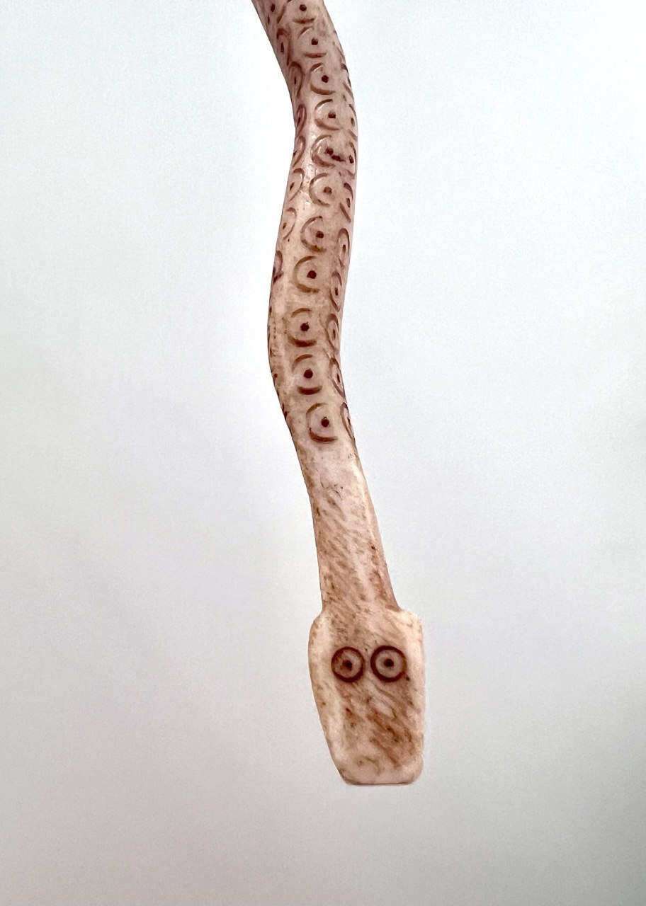 Сначала я думал, змейка из дерева, просто твердого какого-то. Удобнее всего ей чесать под лопаткой допустим если чешется, как раз дотянуться в самый раз. А потом змейка понемногу стала выцветать, и стало понятно, что это не дерево, а кость. Надеюсь, буйвола или верблюда или что-то такое, черные кабанчики там бегали помню через поле между джунглями, никакой анализ делать не охота. Погуглил, вроде это и правда, не заточка, а спиночесалка, традиционный восточный самомассаж, рефлексология, все дела. Ну, хочется верить.