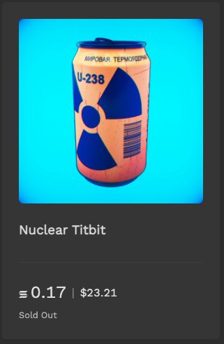 Вниманию нынешних и будущих владельцев редчайших NFT баночек титбита (напоминаю, баночек в коллекции "МИРОВАЯ. ТЕРМОЯДЕРНАЯ. ТВОЯ." всего 100 штук). Баночки начали потихоньку обретать дополнительную ценность: первая была продана недавно за 0.17 SOL ($23). ПРОВАЙДЕРОМ ЛИКВИДНОСТИ стал Роман Комаров из Новосибирска. Кому не досталось баночек