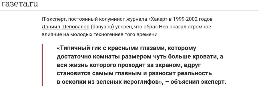 Знакомый написал про Матрицу, что на просмотре у него было ощущение, будто откопали его бабушку и публично надругались. Но я все равно пошел посмотреть. Один бухой чувак там вышел посередине сеанса с криком «Новая матрица говно! Чего вы сидите?». Сзади чувак грустно вздохнув сказал «Да, еще час сидеть, не могу уже». А когда пошли финальные титры добавил: «А я все равно Нео люблю».