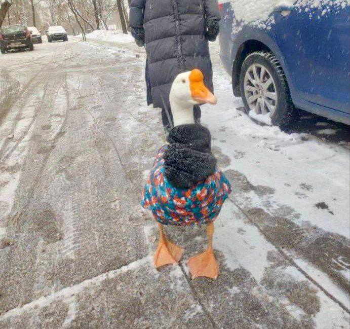 В Москве заметили гуся в свитере и шарфе, он вышел прогуляться.