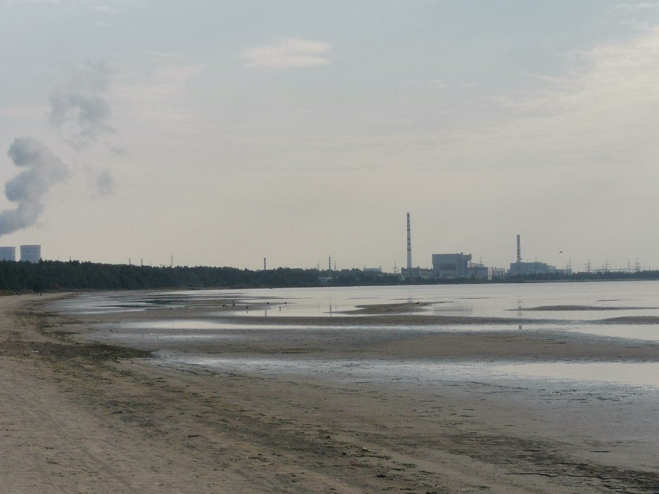 Это Ленинградская АЭС. На этом пляже всегда теплая вода. Если пойти направо, за мысом будет другой пляж, куда все купаться приезжают из Питера, там уже холодная вода.