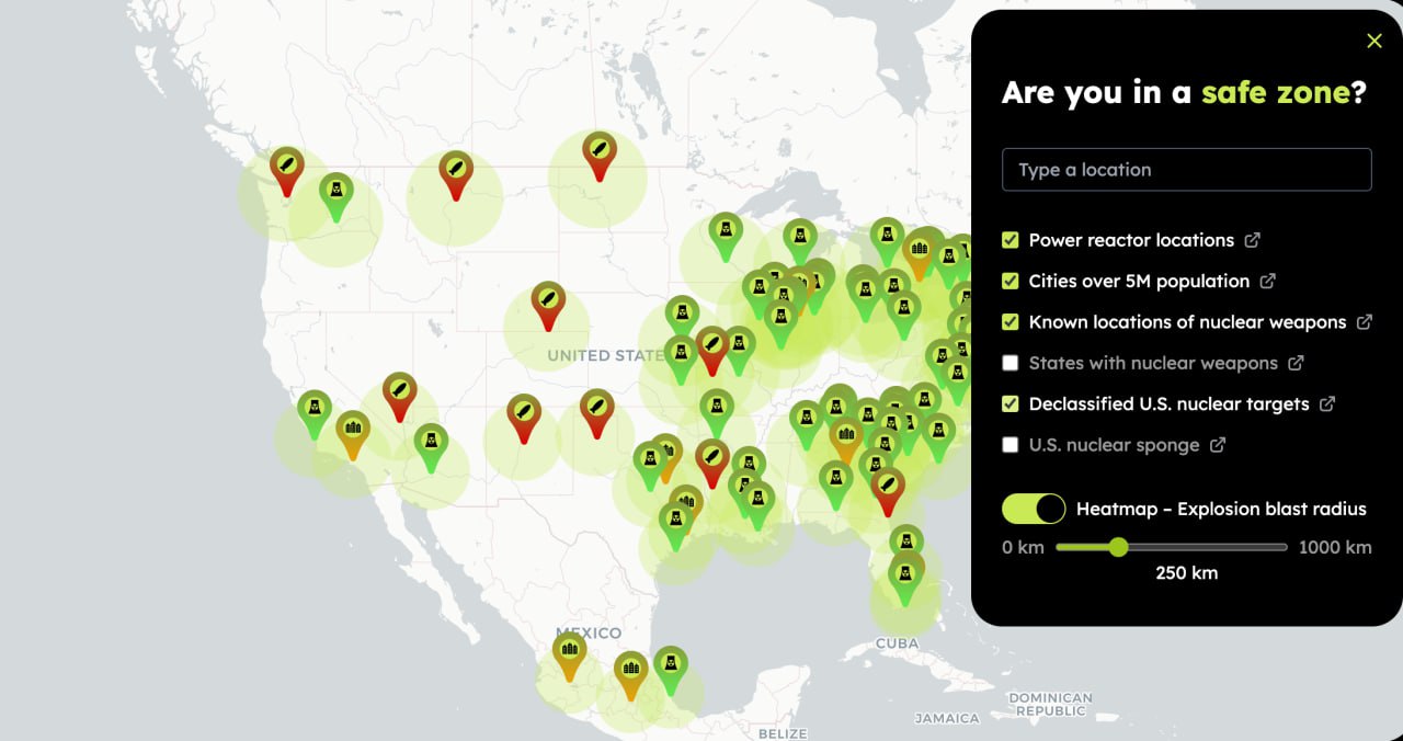 Удивительно, но третье сентября все-таки наступило. Чтобы отметить, можно потыкать Nuclear Disaster Map - геосервис, в котором на карте видны известные риски ядерной опасности. Можно посмотреть город, где вы живете, или куда планируете переехать. Показывает, где есть реакторы, известные места базирования ядерного оружия и рассекреченные американские ядерные цели (спойлер: вы всегда знали, где). Чтобы показали цели, нужно включить чекбокс Declassified U.S. nuclear targets.