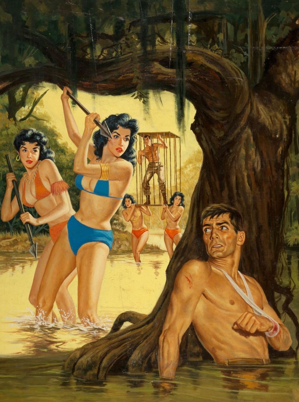 Раньше такого рода сюжеты про амазонок и пойманных мужиков в клетках популярны были. В фильмах много было. Вот обложка бульварного чтива видимо какого-то тоже. А сейчас давно уже как отрезало. Кали-юга, деградирует мир, что поделать.