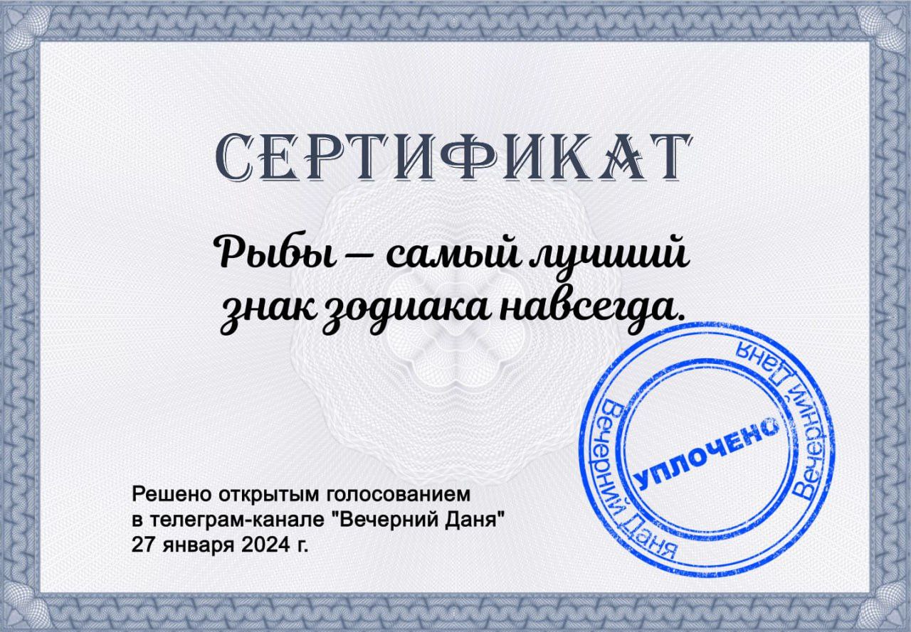 Вот сертификат. Рыбы имеют право распечатать и повесить в рамке на стене. Чтобы всем сразу понятно было, с кем имеют честь общаться.